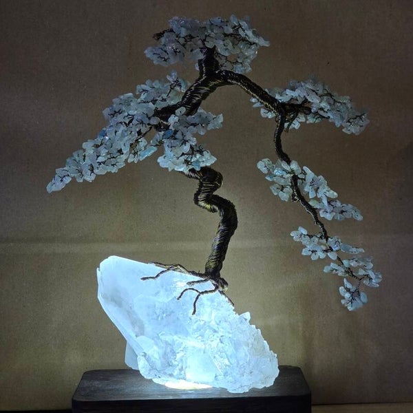 Edelsteenboom gemaakt met Aquamarijn op een unieke bergkristalpunt