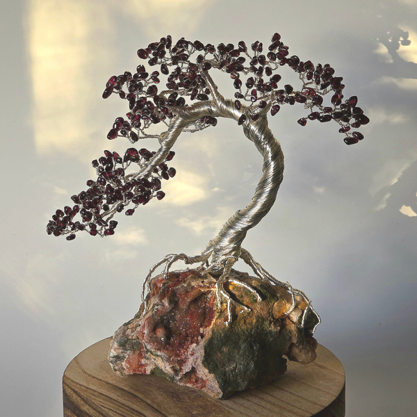 Edelsteenboom gemaakt met granaat blaadjes op een chalcedoon