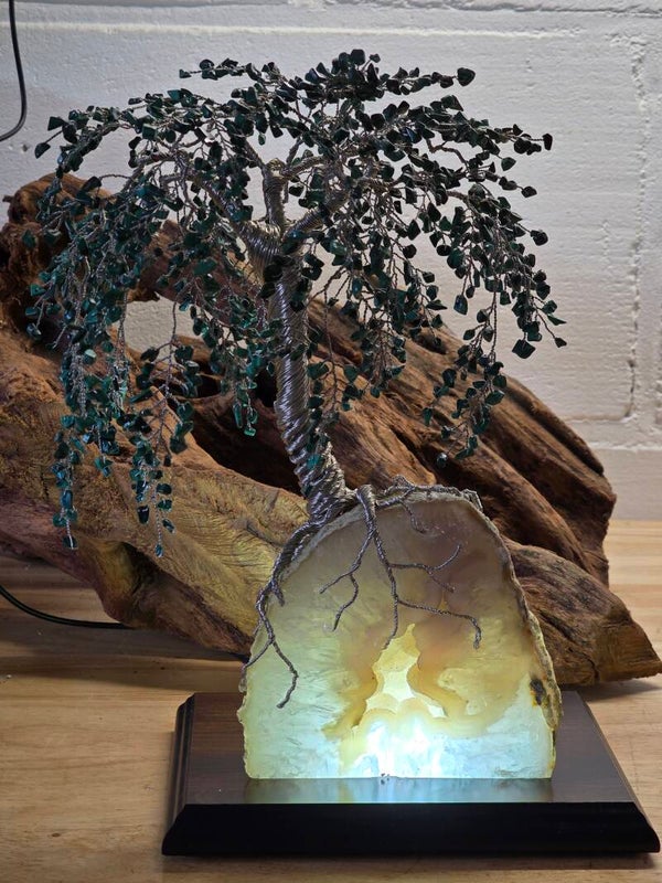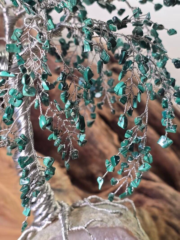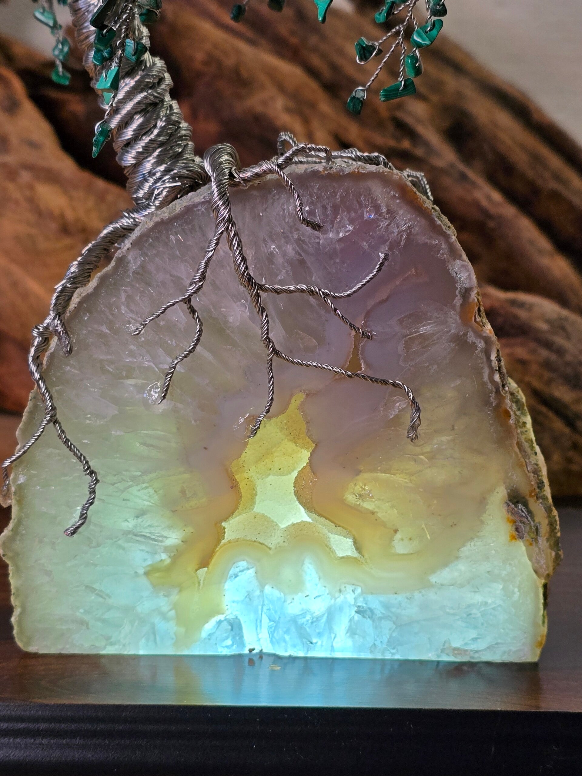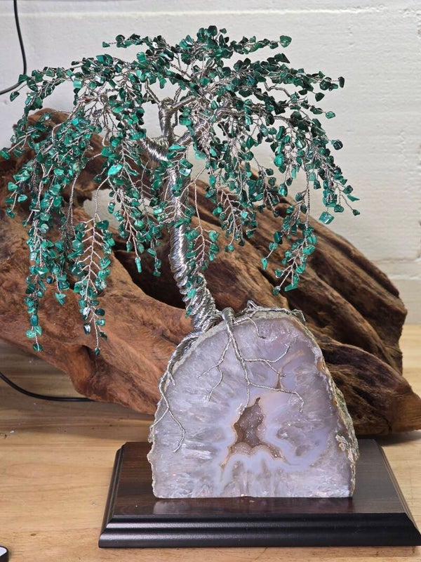 Edelsteenboom gemaakt met malachiet blaadjes op een agaat geode