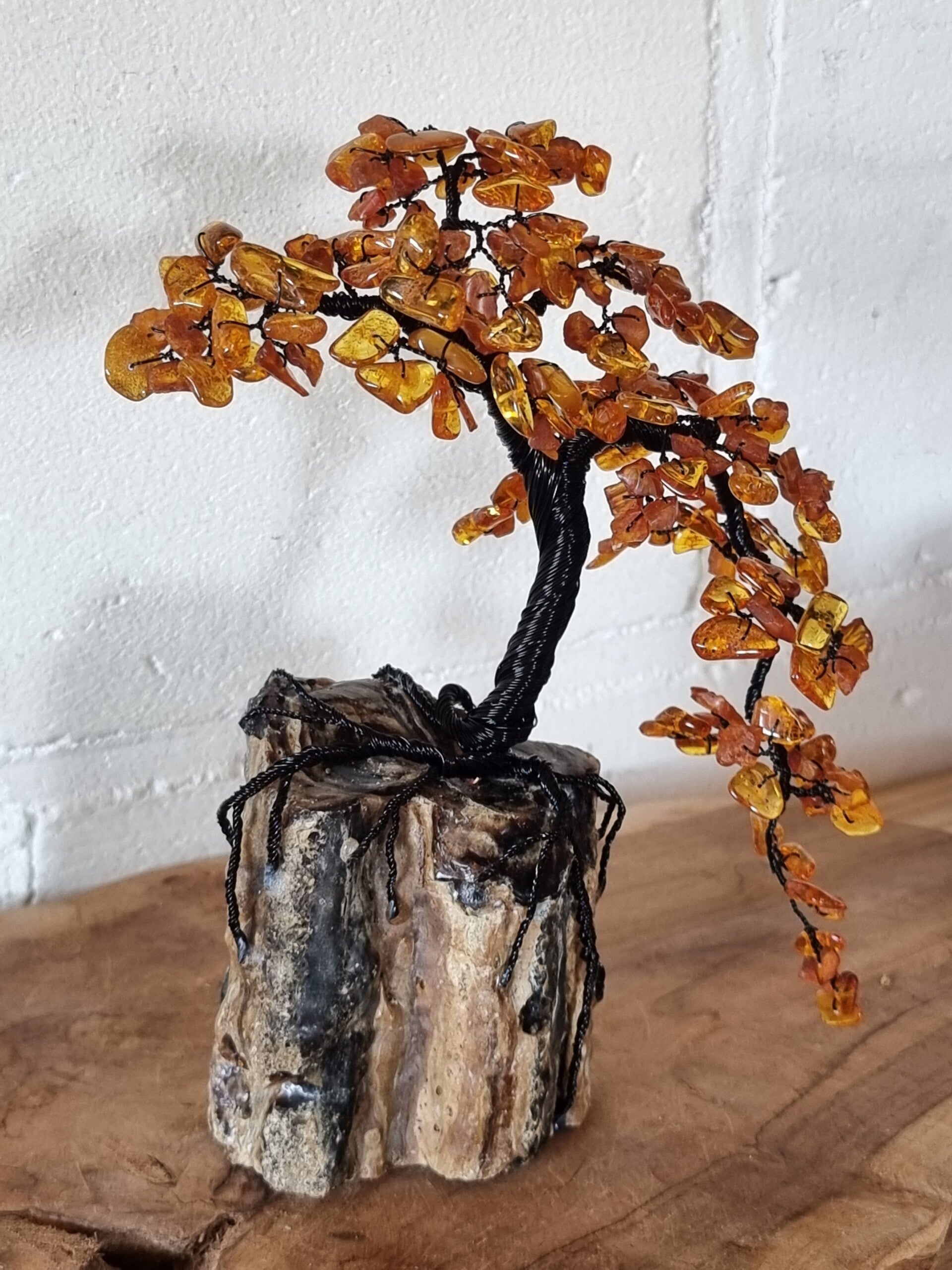 Edelsteenboompje gemaakt met barnsteen blaadjes op een stuk barnsteen uit Indonesië