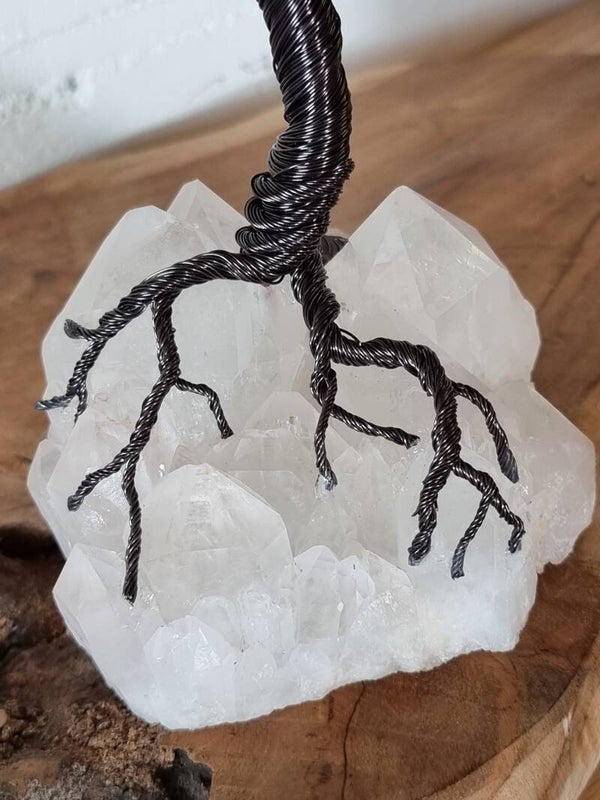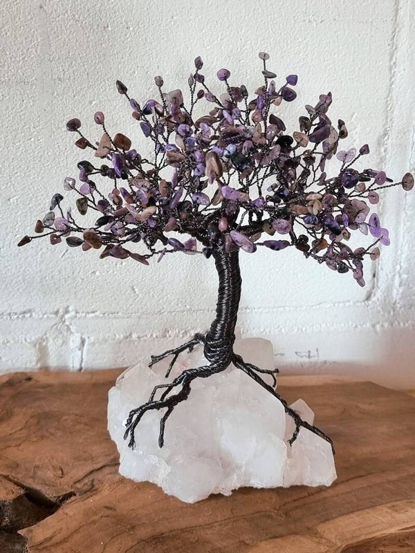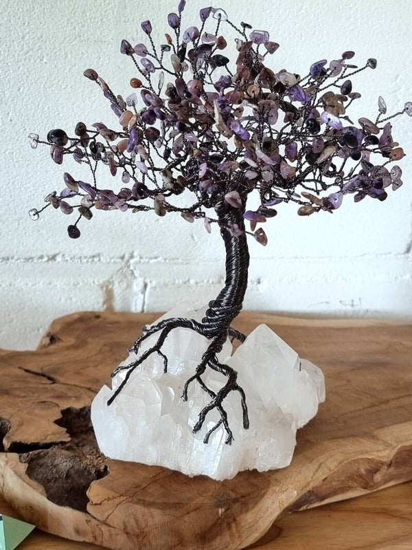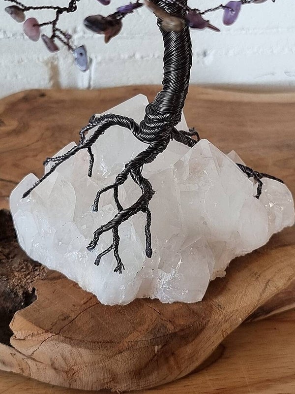 Edelsteenboom gemaakt met charoïet blaadjes op een heel mooi stuk bergkristal