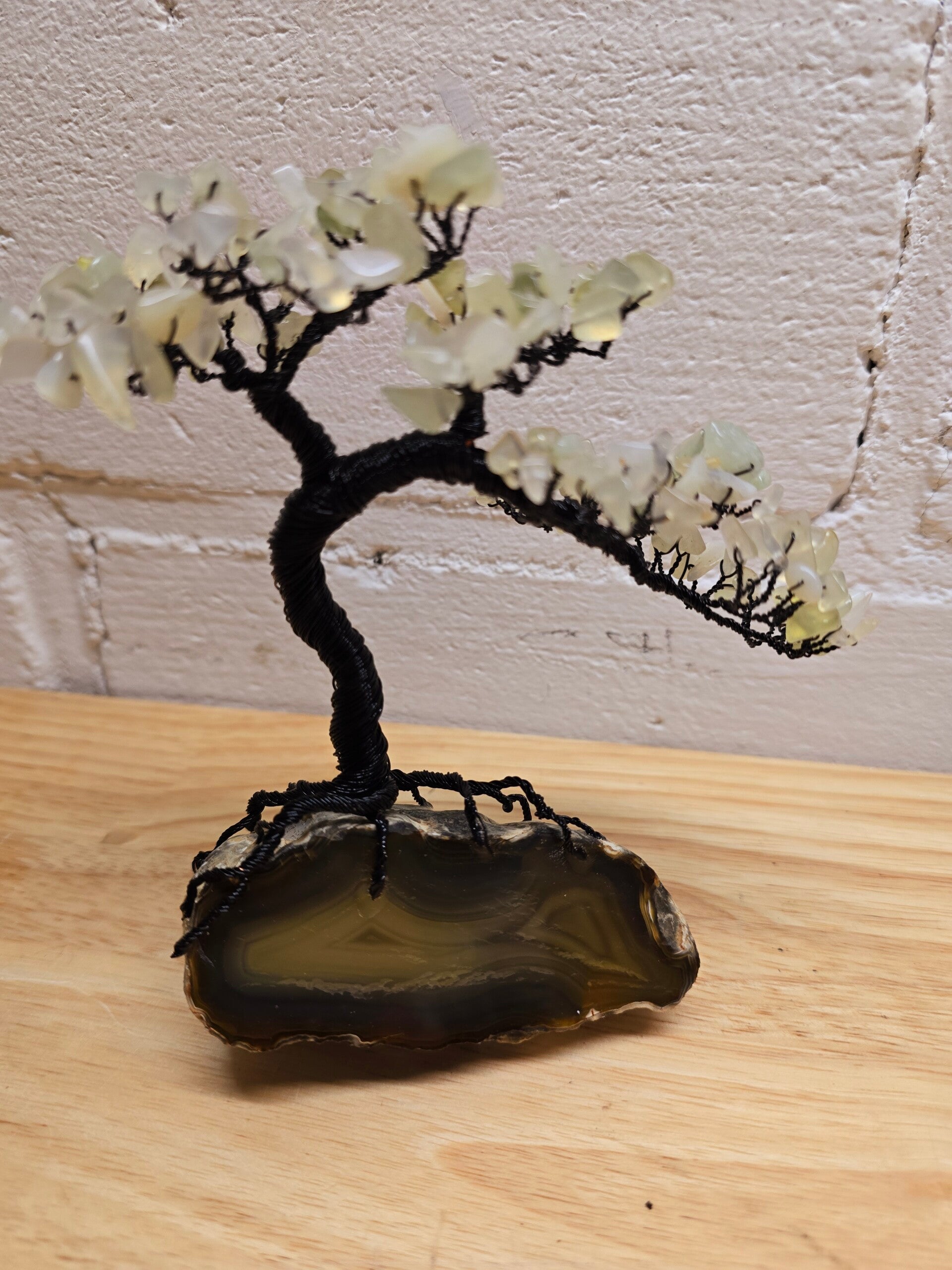Edelsteenboompje gemaakt met serpentijn blaadjes op een stuk agaat