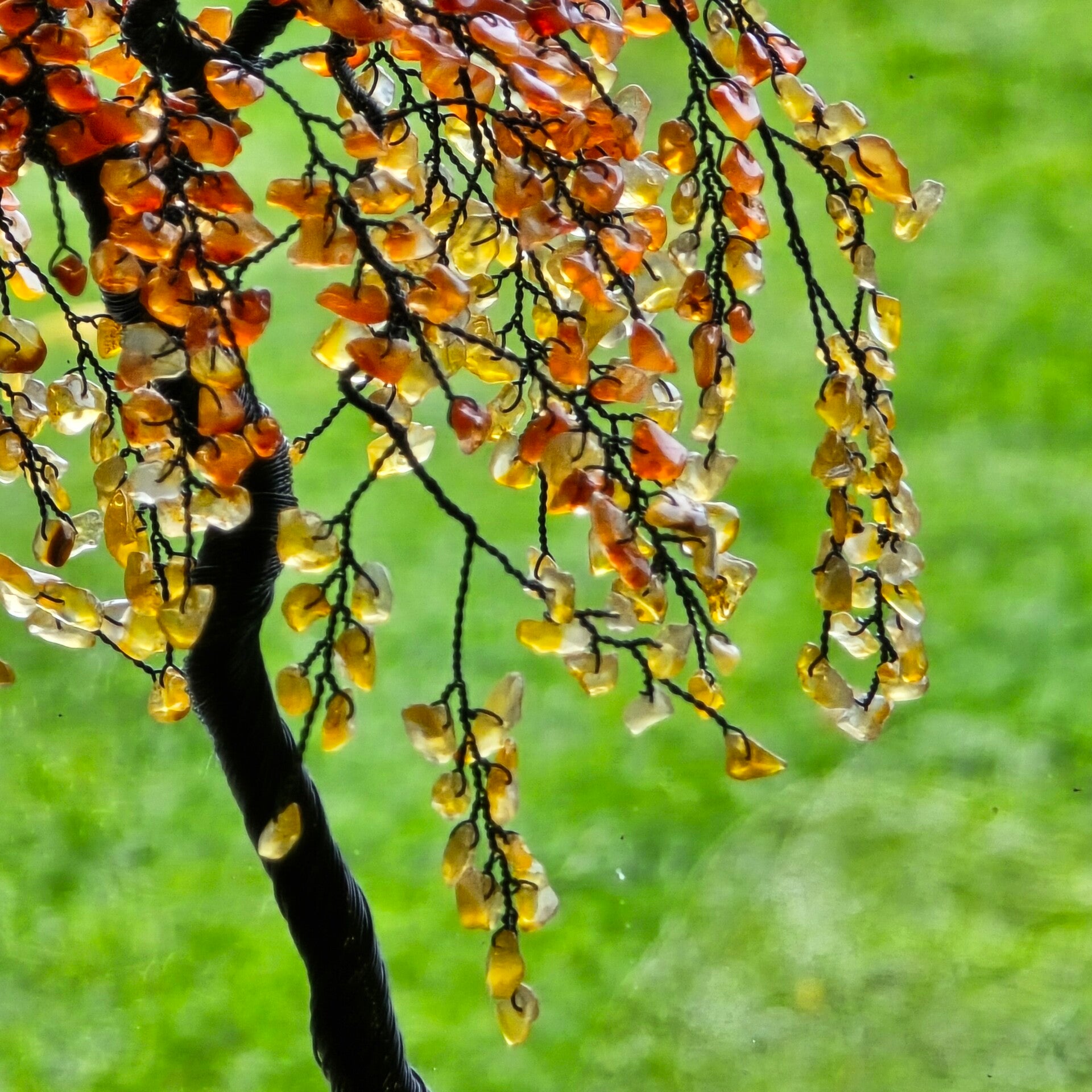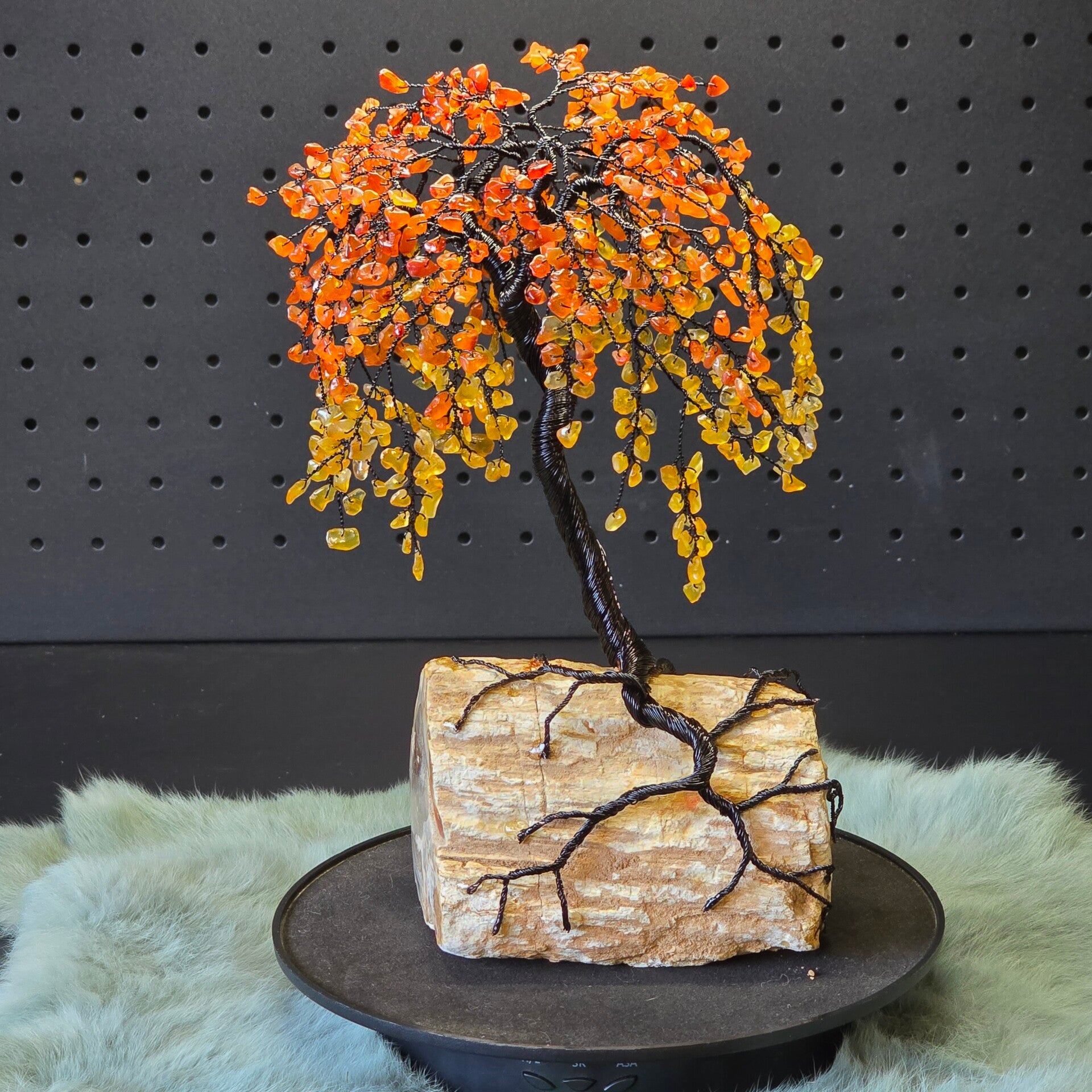Edelsteenboom gemaakt met carneool blaadjes op een stuk versteend hout