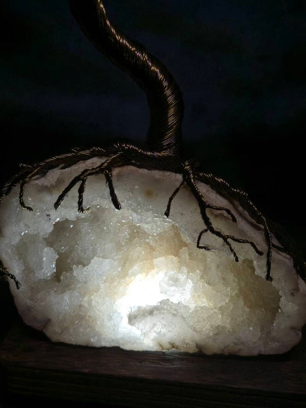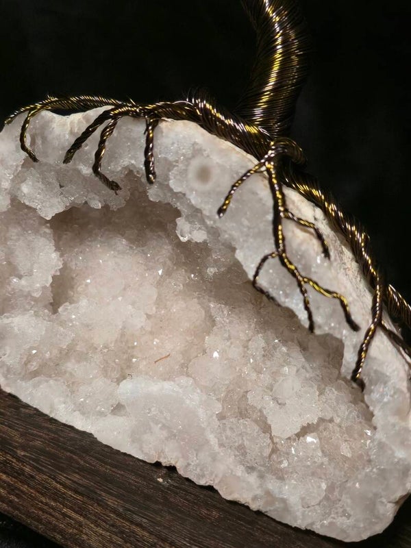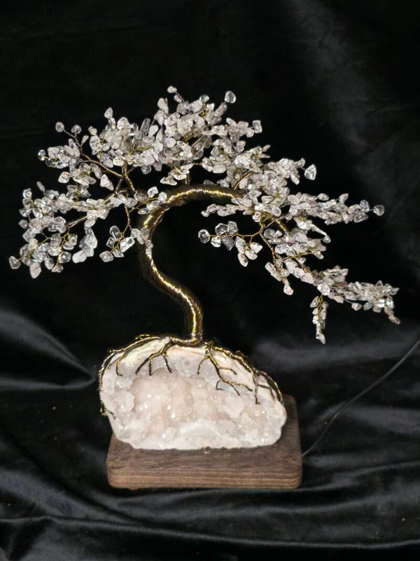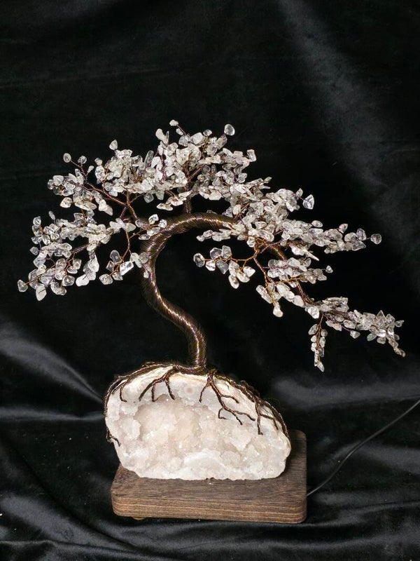 Een exclusief stuk voor liefhebbers van edelstenen, spiritualiteit en bijzondere woondecDeze handgemaakte bergkristal edelsteenboom op natuurlijke agaat geode is een uniek decoratief kunstwerk waarin natuur en ambacht samenkomen. De fijne blaadjes van bergkristal vangen het licht prachtig, terwijl de agaat geode zorgt voor een krachtige, aardende basis.