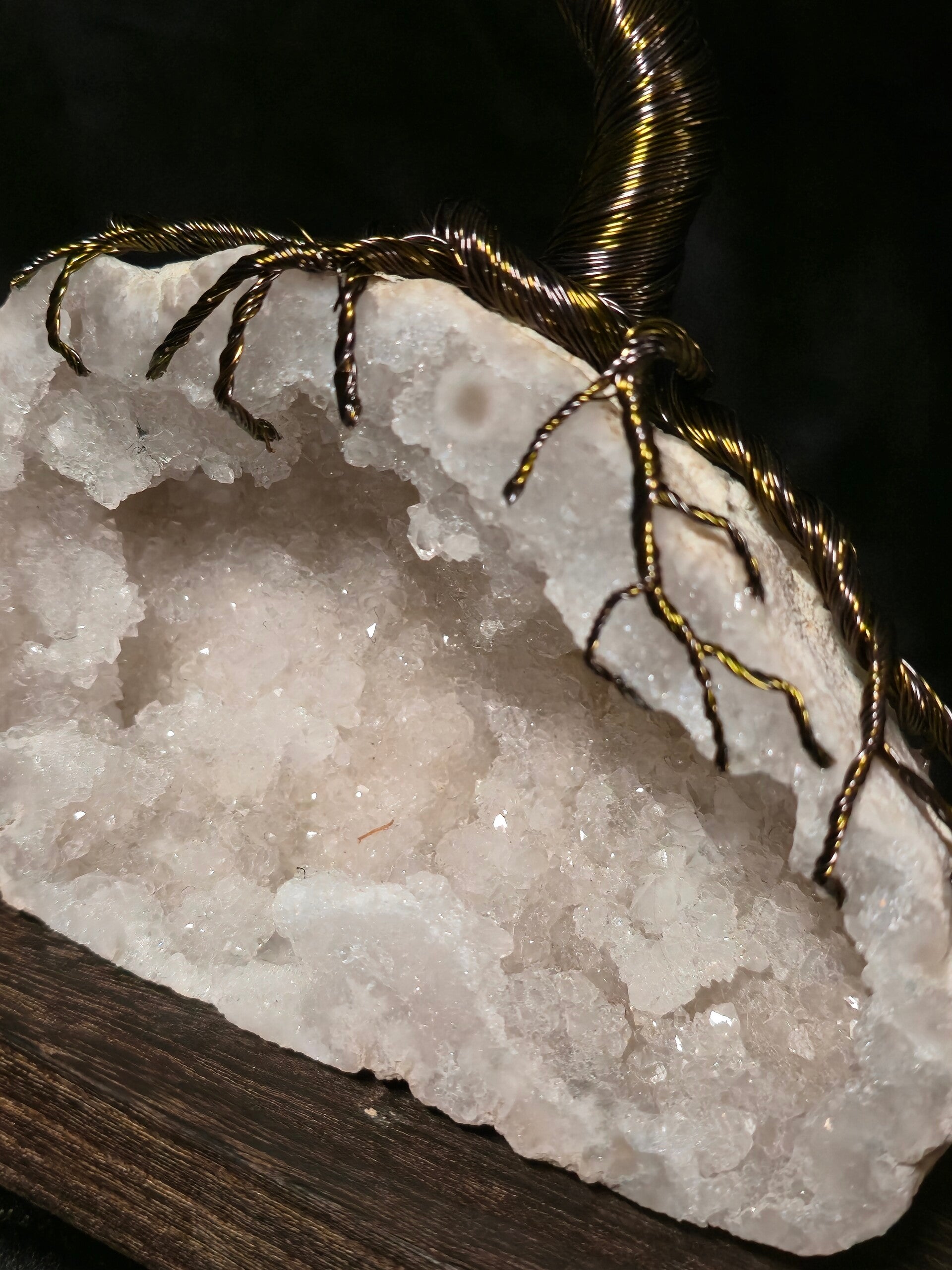 Deze handgemaakte bergkristal edelsteenboom op natuurlijke agaat geode is een uniek decoratief kunstwerk waarin natuur en ambacht samenkomen. De fijne blaadjes van bergkristal vangen het licht prachtig, terwijl de agaat geode zorgt voor een krachtige, aardende basis.