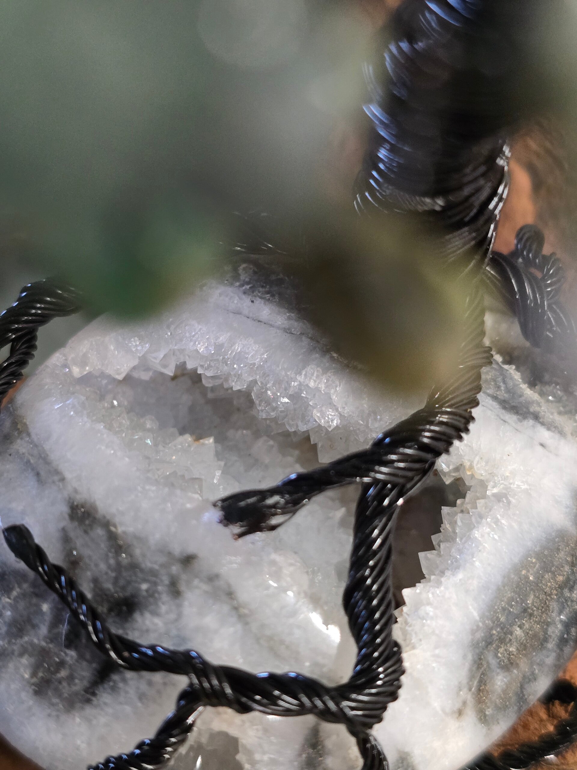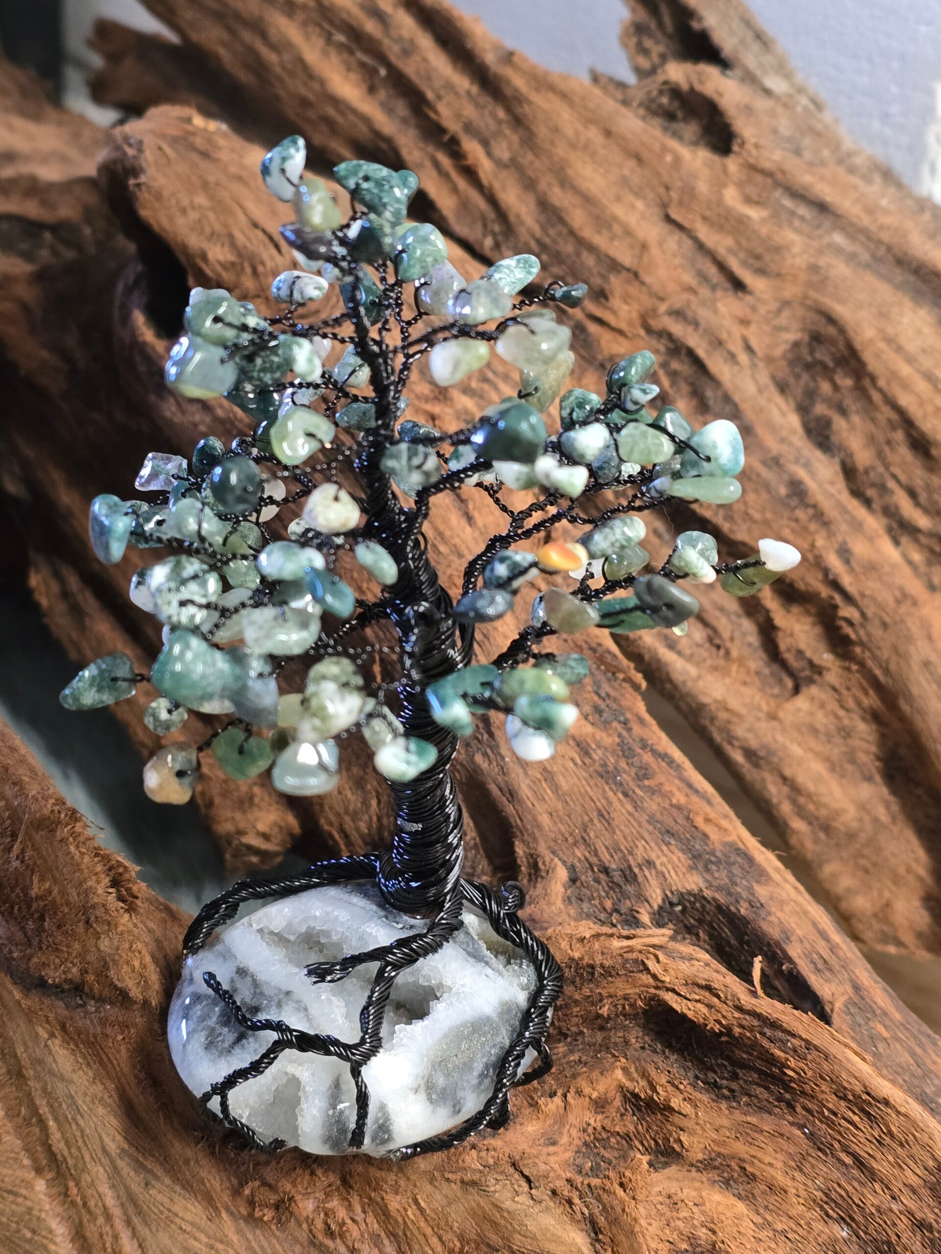 Edelsteenboompje gemaakt met mosagaat op een druzy agaat stukje