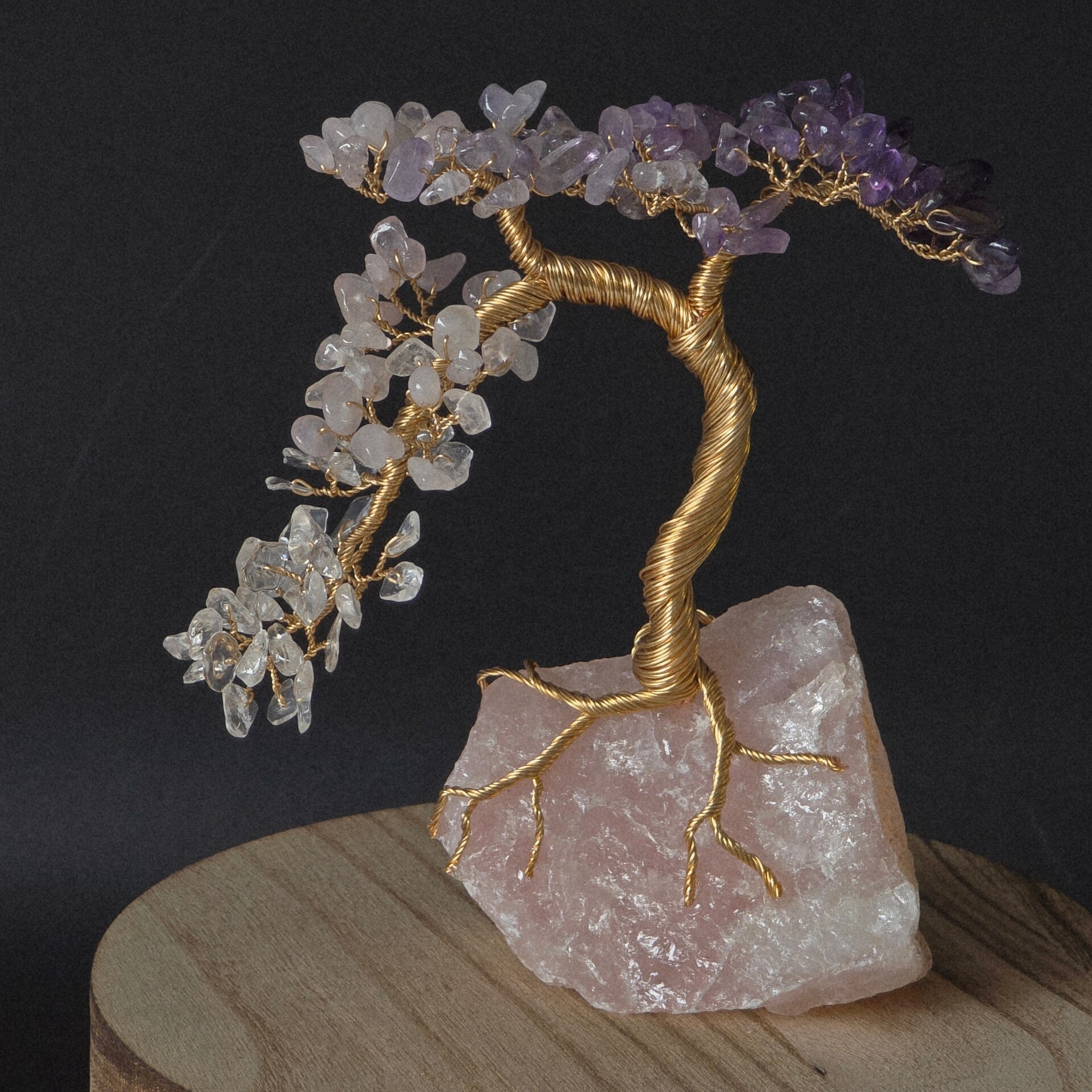 Edelsteenboompje gemaakt met amethist, Rozenkwarts en bergkristal blaadjes op een stukje Rozenkwarts