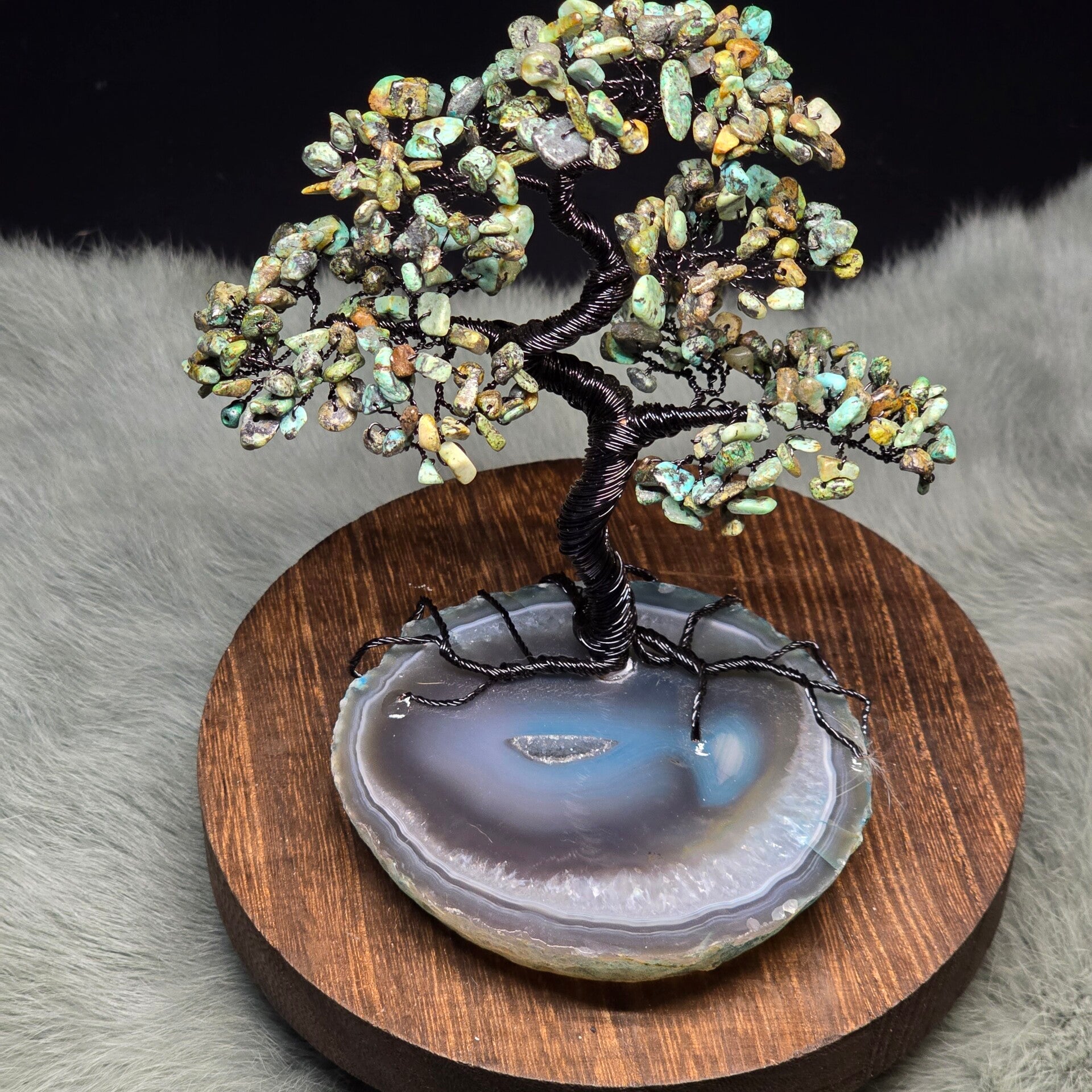 Deze bijzondere edelsteenboom is met de hand gemaakt en combineert drie krachtige elementen: Afrikaanse turkoois (jaspis) en een natuurlijke agaatschijf als basis. De boom is 16 cm hoog en bestaat uit zorgvuldig geselecteerde steentjes die met liefde zijn verwerkt tot een uniek kunstwerk.