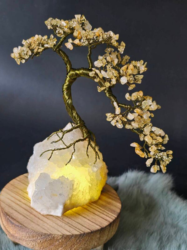 Dit unieke edelsteenboompje is gemaakt van verhitte amethist, ook wel “citrien” genoemd. Door verhitting krijgt amethist een warme, goud-gele gloed die bekendstaat om zijn stralende, zonnige energie.