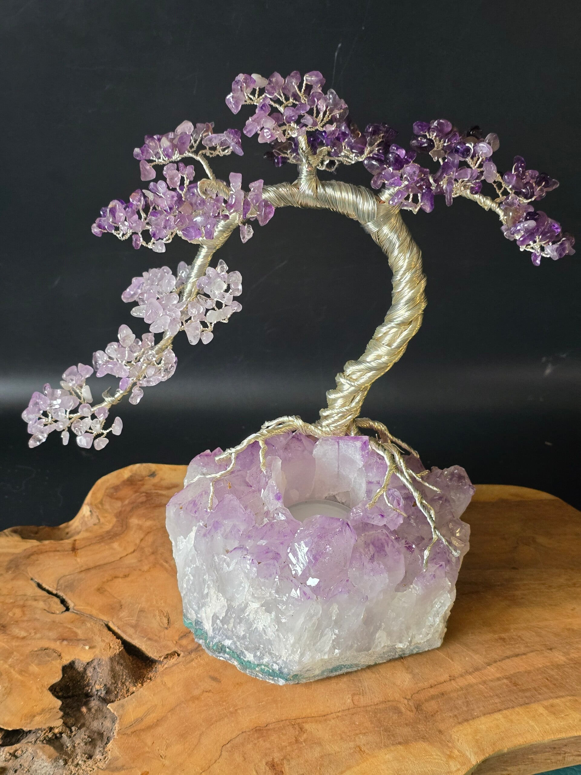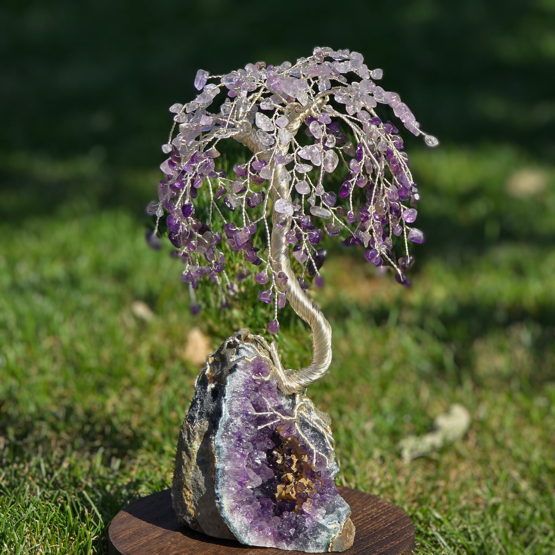 Deze handgemaakte amethist edelsteenboom brengt een gevoel van rust, harmonie en bescherming. Amethist staat bekend om zijn kalmerende werking, het verzachten van stress en het versterken van spirituele groei.